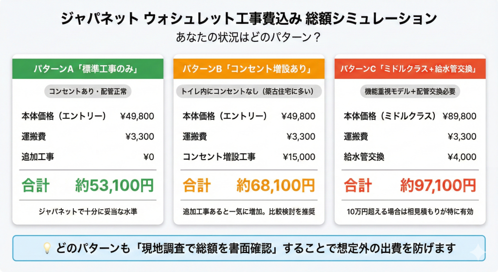 実際にウォシュレットを導入する際、総額がいくらになるのかをパターン別にシミュレーションしてみましょう。