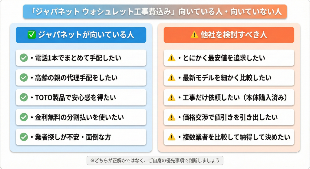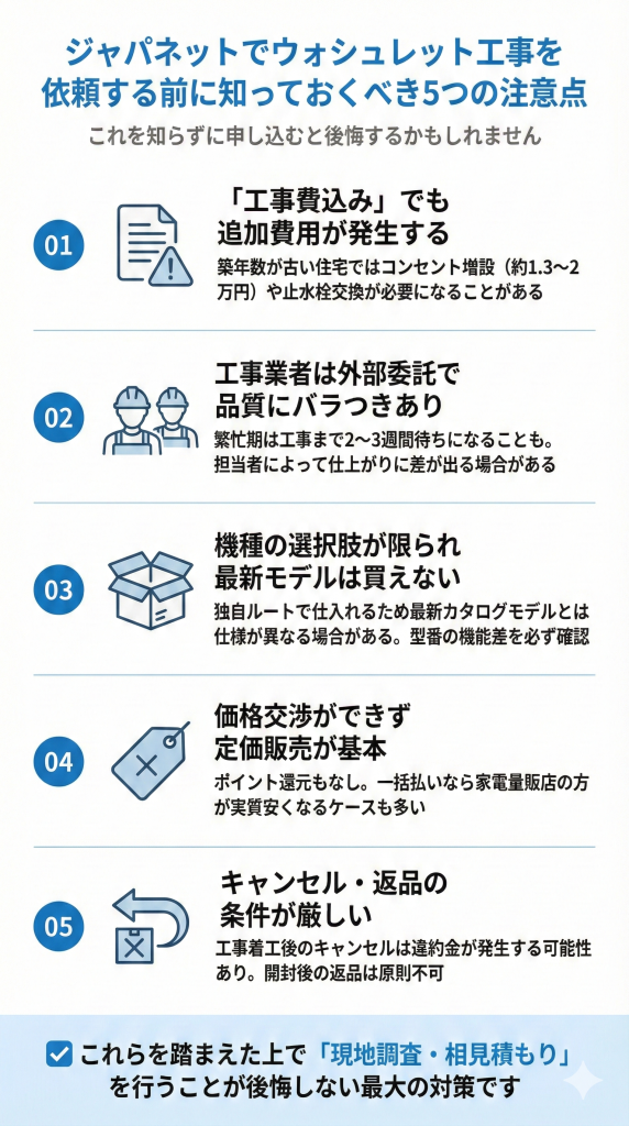 ジャパネットのウォシュレット工事費込みプランは、電話一本で手配できる手軽さ・金利無料の分割払い・有名メーカー製品の安心感という明確なメリットがあります。一方で、追加費用の発生リスクや機種の選択肢の少なさなど、事前に把握しておくべき注意点もあります。