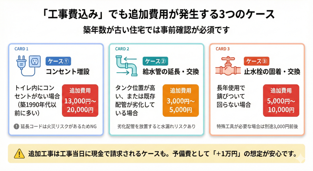 ⚠️ 別途費用が発生するケースコンセント増設(トイレ内に電源がない場合)/給水管の延長・交換(配管が劣化・位置がズレる場合)/止水栓の交換(錆びついて動かない場合)/特殊工具が必要な固着ナットの切断など